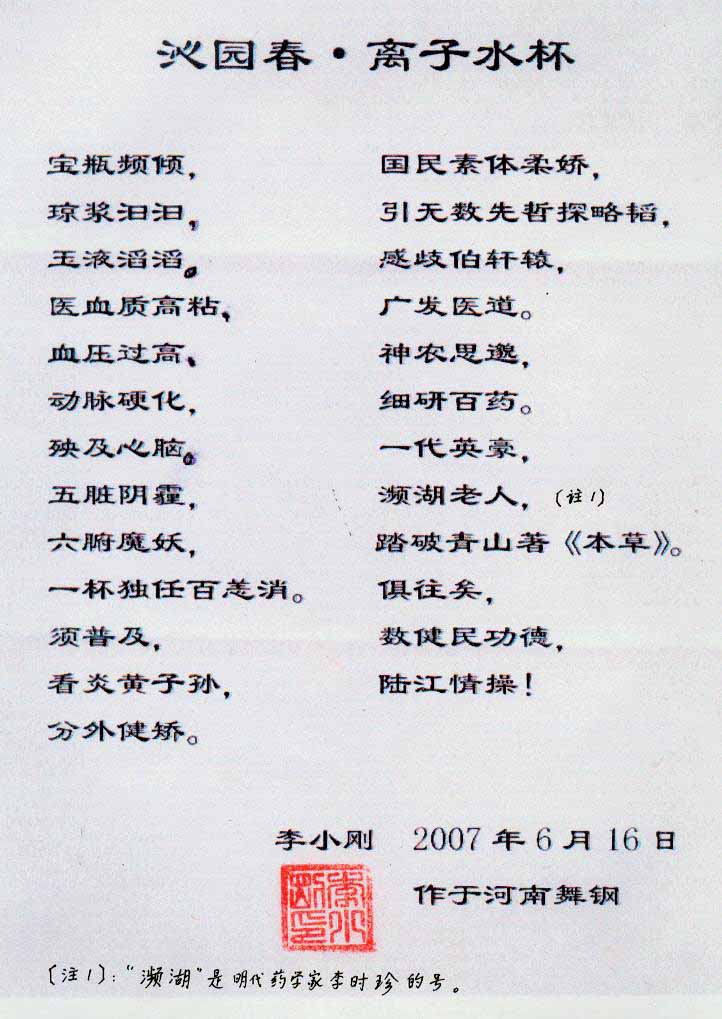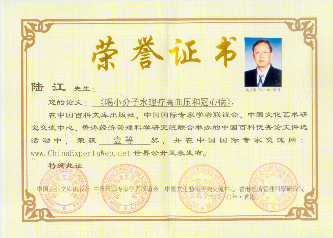 -----我是從事建筑的高工,本來沒有資格去攻克醫(yī)學(xué)難題,卻為了自身健康才扣響醫(yī)學(xué)的大門。由于我1990年患高血壓,因怕中風(fēng)才研究發(fā)明了離子水瓶,我把水處理成微小分子團(tuán)水,飲用后治愈了高血壓。便于1993年底送到三家省級醫(yī)院做臨床試用4個月。經(jīng)北京和廣西醫(yī)學(xué)專家鑒定:"降脂降壓效果好"," 能擴(kuò)大心腦動脈流量,改善心腦電圖以及微循環(huán)","對治療心腦動脈粥樣硬化、高血壓、高血脂有良好的醫(yī)療保健作用。""產(chǎn)品的技術(shù)性能和療效達(dá)到了同類產(chǎn)品的國內(nèi)領(lǐng)先水平,經(jīng)廣西醫(yī)學(xué)科學(xué)情報研究所檢索,未見國外有類似報道。"中國醫(yī)學(xué)科學(xué)院張正國教授從美國國立醫(yī)學(xué)圖書館數(shù)據(jù)庫存Medline檢索英俄文資料,均未見類似報告。2000年上市后,我為了對消費(fèi)者負(fù)責(zé)而繼續(xù)觀察研究,一直通過《信譽(yù)卡》和《質(zhì)量跟蹤調(diào)查書》向患者承諾療效,請用戶使用6個月后反饋效果。和脂壓患者飲用2至5個月內(nèi),消除癥狀,停服藥物,血壓正常;冠心病患者飲用3~5個月逐漸減輕至消除心絞痛、房顫等癥狀,不再服藥,飲用1年左右心電圖正常,經(jīng)冠脈造影掃描無明顯狹窄,表明冠心病痊愈。大量患者還反映許多衰弱器官被修復(fù),讓前列腺增生、慢性咽喉炎、慢性氣管炎、支氣管炎、慢性胃炎、腸炎和膽囊炎等不藥而愈;2型糖尿病患者是因為胰島衰弱致病,飲用該水半年至一年,逐漸減藥至停藥,血糖尿糖正常,真正治愈2型糖尿病。中風(fēng)后遺癥患者飲用六七個月,可逐漸減輕至消除肢體和語言障礙,表明飲用該水能讓壽命很長的神經(jīng)元細(xì)胞逐漸修復(fù),奇跡般地恢復(fù)肢體和語言功能。飲用后還使胸腺和脾臟兩個重要的免疫器官被修復(fù)和增強(qiáng),產(chǎn)生免疫細(xì)胞多,提高了免疫力,使人不生病或少生病。自此, 飲用微小分子團(tuán)水創(chuàng)造了攻克冠心病、高(低)血壓和糖尿病三大醫(yī)學(xué)難題的奇跡。人們對此感到不可思議,但實(shí)踐是檢驗真理的唯一標(biāo)準(zhǔn)。